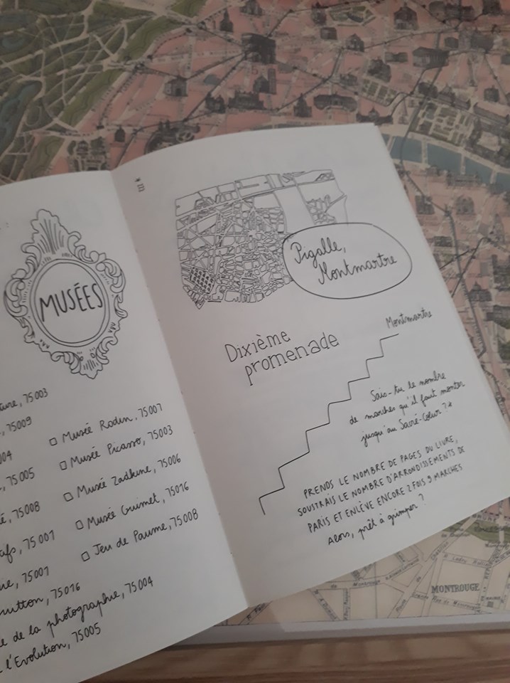 Ce carnet sympathique compte plus de dix ballades dans le centre et l’est parisien (le 16eme, le 15eme et le 8eme arrondissement sont boudés) : Gobelins et jardin des Plantes, Pigalle et Montmartre, Belleville, République et canal Saint-Martin, Luxembourg-Saint Sulpice et Saint-Germain des prés, Rue du Bac et Invalides, Bastille et Charonne, Sentier-Montorgueil, Louvre et Palais royal, Marais et Île Saint-Louis, Haut Marais….