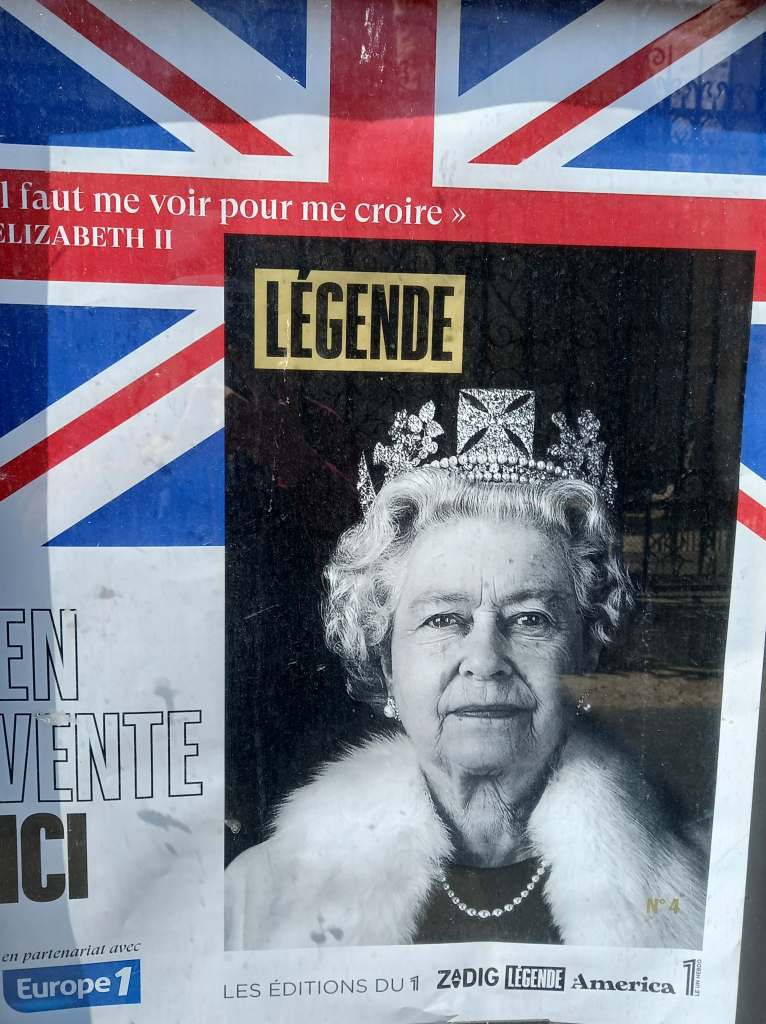 Début avril, le deuil de la reine Elisabeth II m’a émue. Non pas par leurs titres, mais parce que leur amour avec son mari depuis 73 ans était beau à voir. J’ai photographié une couverture de revue qui lui était consacrée à l’occasion de ses 95 ans le 21 avril. La reine était omniprésente dans les rues de Paris grâce à cette revue.