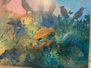 Il utilise les encres mais aussi la peinture acrylique et la peinture à l’huile pour créer une sorte de glacis. Cela apporte de la profondeur à ses oeuvres grâce aussi à l’usage de la feuille d’or.
