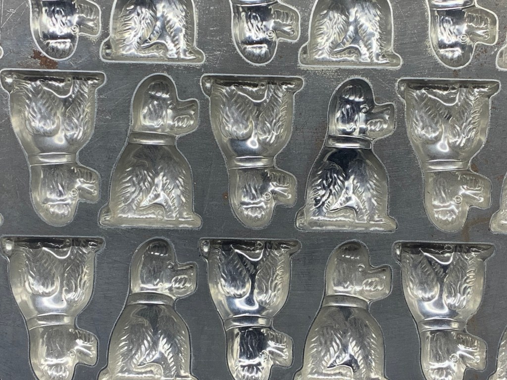 On y voit la machine à écrire Remington de l’entreprise, les moules en métal pour fabriquer d’adorables petits chocolats en forme de caniches ou d’immenses œufs de Pâques.