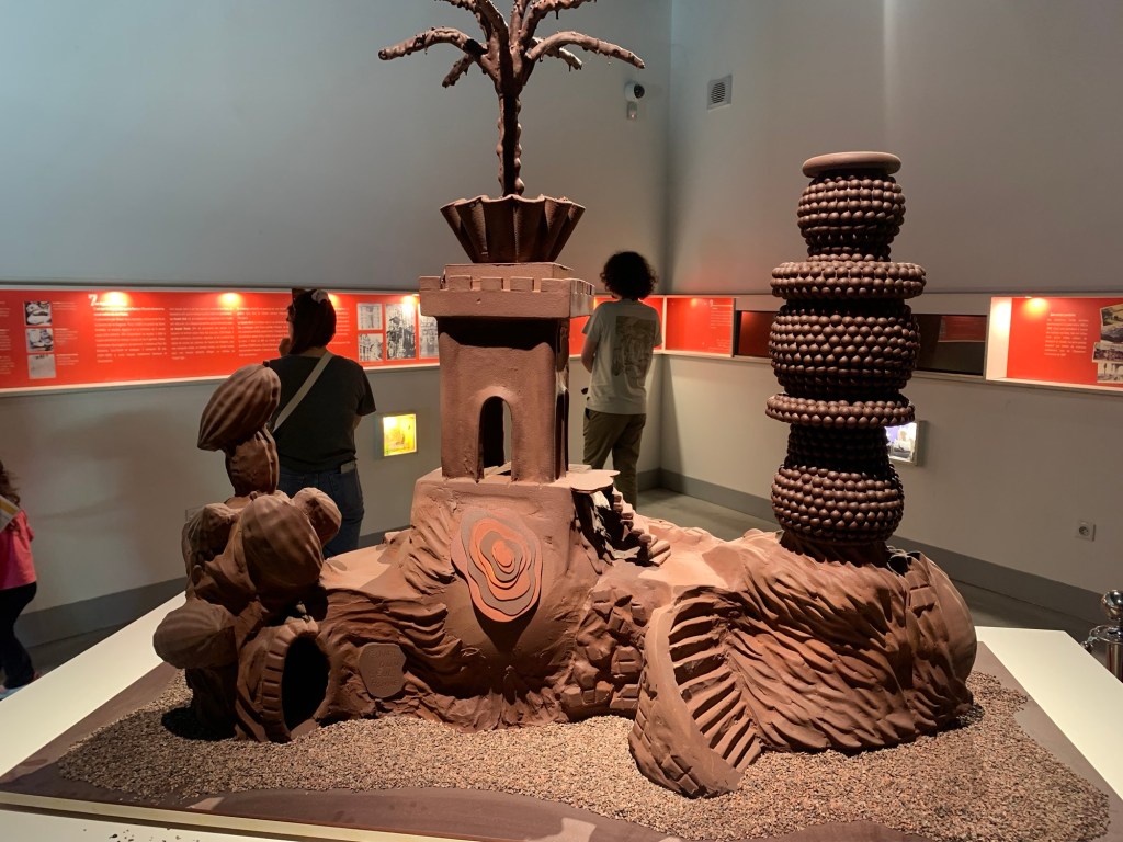 Les poids lourds jouaient un peu les trouble-fête dangereux pour traverser la route mais c’est un très beau musée. Grâce à votre billet de train, vous pouvez avoir droit à une réduction bas carbone (9.50€ l’entrée: le tarif réduit). La cité du chocolat se déploie au rez de chaussée et au premier étage.