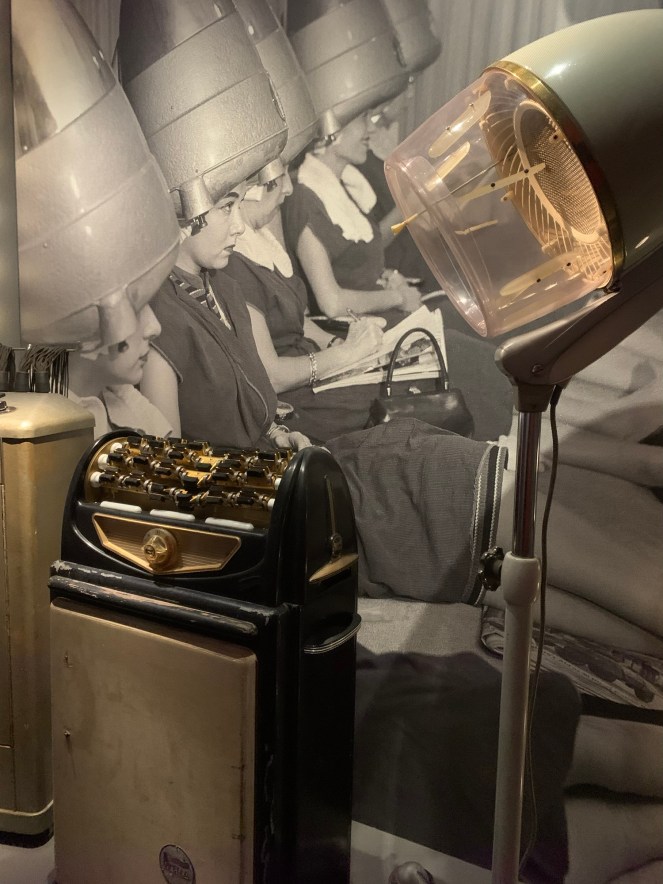 Sa transformation physique ne se fait pas sans douleur. Cette énorme machine à permanente exposée judicieusement pourrait s’apparenter à un outil de torture, on demandait aux jeunes femmes de se faire replanter la racine des cheveux ou on leur fracturait volontairement la mâchoire selon des critères de beauté très normés.