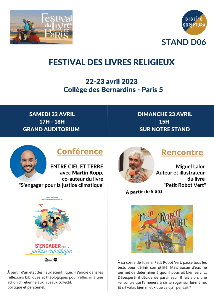 Retrouvez les éditions Bibli’o Scriptura sur le stand D-06 au Festival des livres religieux au Collège des Bernardins le 22 et 23 avril, de 10 heures à 18 heures.