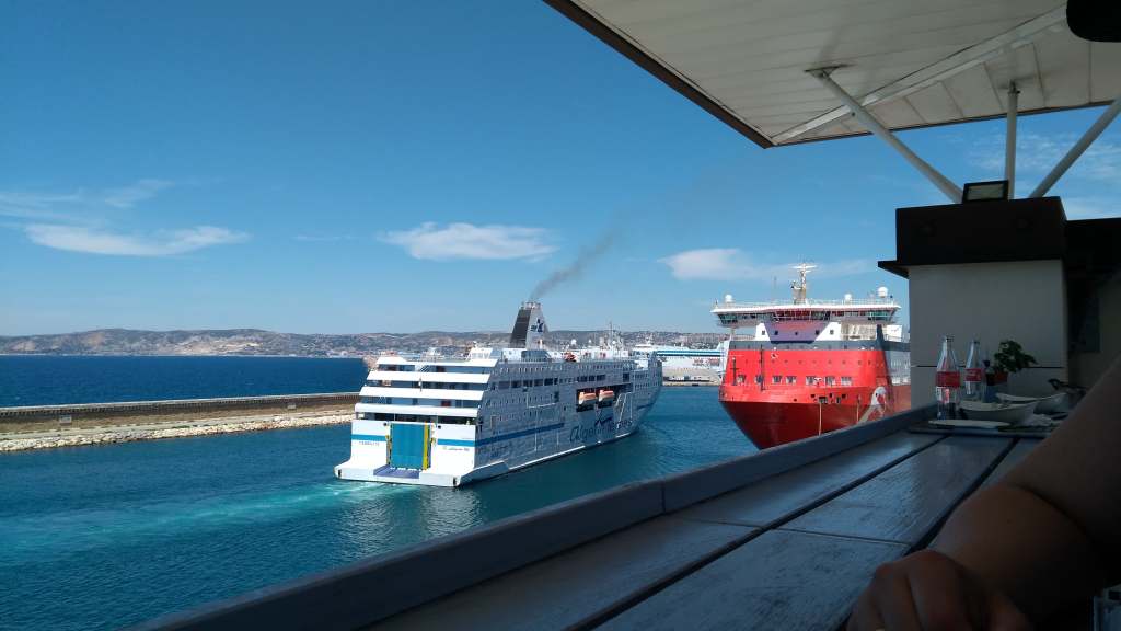 Nous avons suivi notre tour touristique habituel le long de la Corniche Kennedy pour atterrir à notre rooftop de prédilection : Vapiano aux terrasses du port. Vue imprenable sur le port de la Joliette et des docks.